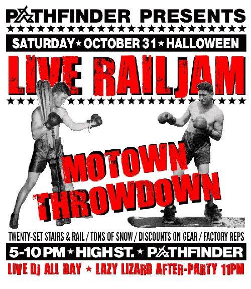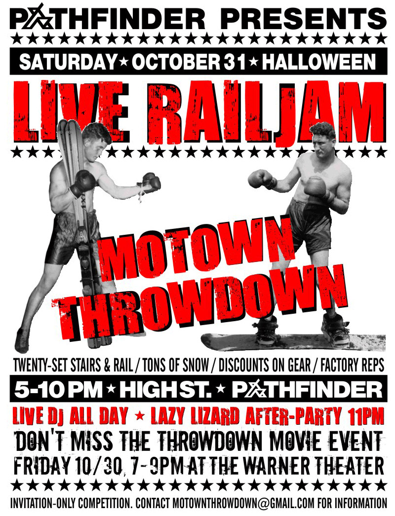 The Motown ThrowDown features a live DJ all day, tons of snow, 20-set stairs and rail, discounts on gear, factory reps., and an invitation ONLY rail-jam competition from 5-10 PM with photos by iPlayOutside!